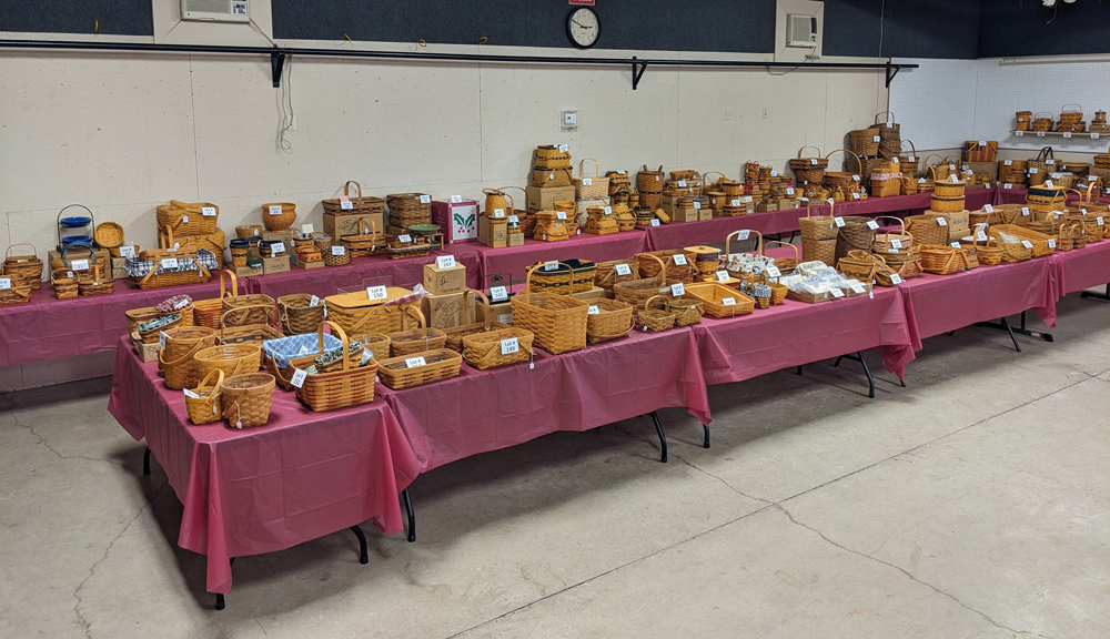 Preview from 11 AM sale day LONGABERGER: Approx. (325) cataloged lots of baskets and pottery spanning the decades. Many pieces of pottery – pie plates, Fruit Medley pitcher, mugs, platters,…